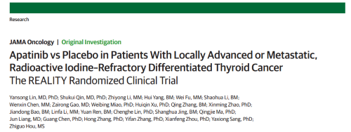2021年12月16日,权威医学杂志《JAMA Oncology》(影响因子31.777)在线发表阿帕替尼的一项III期临床研究(REALITY)——甲磺酸阿帕替尼片治疗局部进展/转移性放射性碘难治性分化型甲状腺癌(RAIR-DTC)患者的多中心、随机、双盲、安慰剂对照临床研究。此研究由北京协和医院的林岩松教授和南京金陵医院的秦叔逵教授发起,在全国21个研究中心展开,由AG亚游医药中央医学事务部团队支持完成。