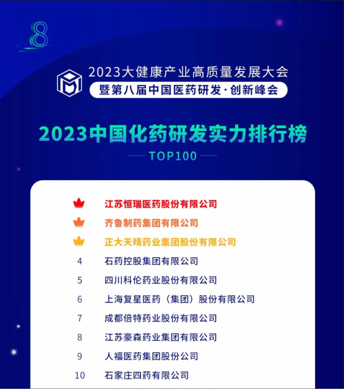由药智网、中国药业杂志社主办的2023大健康产业高质量发展大会暨第八届中国医药研发•创新峰会于6月16日开幕,会上发布了《2023中国药品研发实力排行榜》系列榜单,AG亚游医药凭借深厚的创新研发实力再创辉煌:荣登《2023中国药品研发综合实力排行榜TOP100》榜首、《2023中国化药研发实力排行榜TOP100》榜首。值得一提的是,今年是AG亚游医药连续第6年入选《中国药品研发综合实力排行榜》榜首。